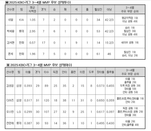 한국야구위원회(KBO)가 3~4월 최우수선수(MVP) 후보 8명을 선정해 2일 발표했다.