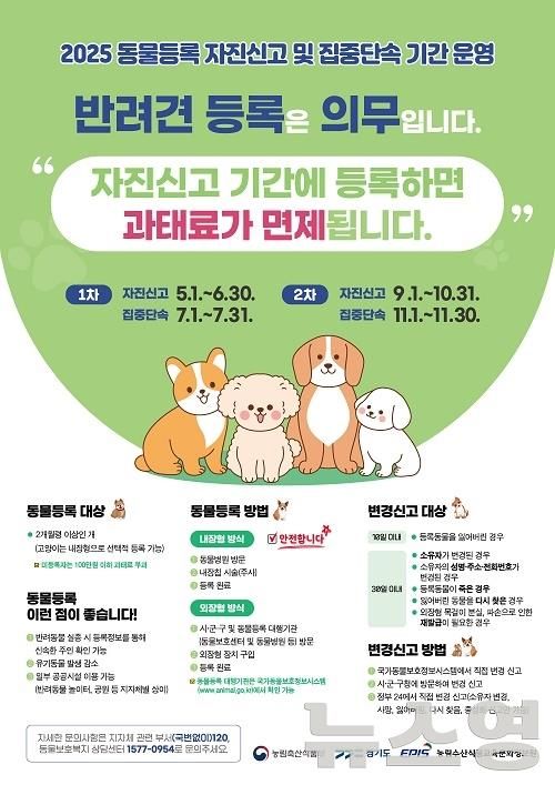 (뉴스영 이현정 기자) 경기도가 5월부터 ‘2025년 동물 등록 자진신고 및 집중단속 기간’을 운영한다.