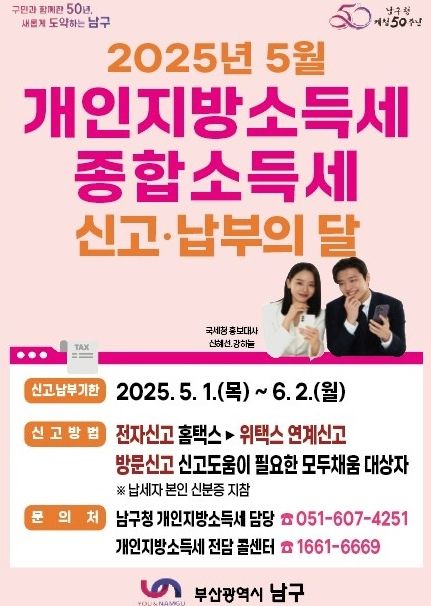 한편, 오은택 남구청장은 컴퓨터나 스마트폰 사용이 힘든 고령자와 정보취약계층을 위해 종합소득세 및 개인지방소득세 확정신고센터(남구청 3층 세무2담당관 설치)를 운영해 방문신고(모두채움대상자)를 지원하고 특히, 산불 피해 납세자, 제주항공피해자, 경영이 어려운 납세자에 대해서는 납부기한 연장을 추진해 민생경제 안정을 위해 최선을 다하겠다고 밝혔다.