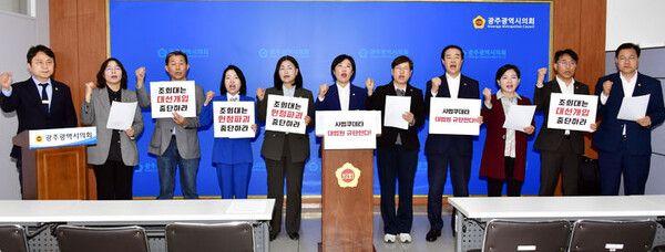 더불어민주당과 무소속 광주시의회 의원들이 2일 이재명 후보에 대한 대법원의 선거법 위반 혐의 파기환송을 규탄했다.