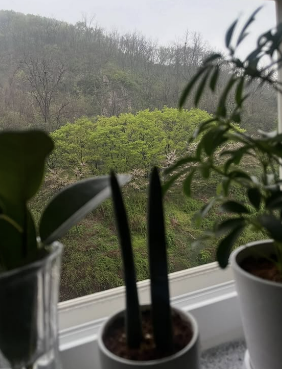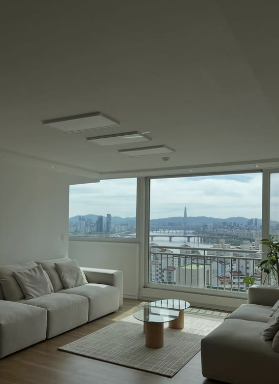 화이트 톤으로 정리된 인테리어에 베란다 창 밖으로 너른 한강뷰가 눈길을 끈다. 또다른 사진에 담긴 다른 방향 창문에는 푸릇푸릇한 숲이 담겨있다.