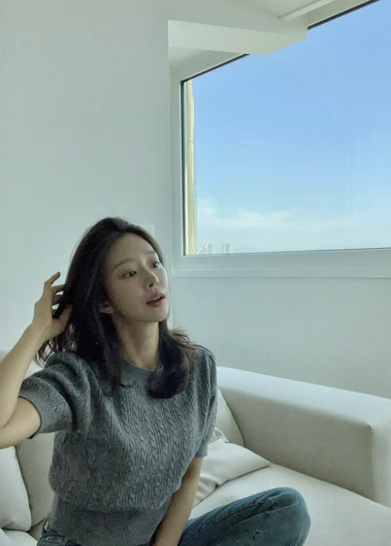 공개된 사진 속 이주빈은 짙은 회색 상의에 청바지를 매치한 편안한 차림으로 새집 거실 소파에 앉아있다.