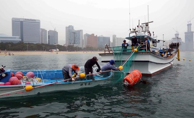 부산 해운대구청소속 근로자들이 부산 해운대해수욕장 앞바다에 어선을 동원해 해파리 차단망을 설치하고 있는 모습 / 뉴스1