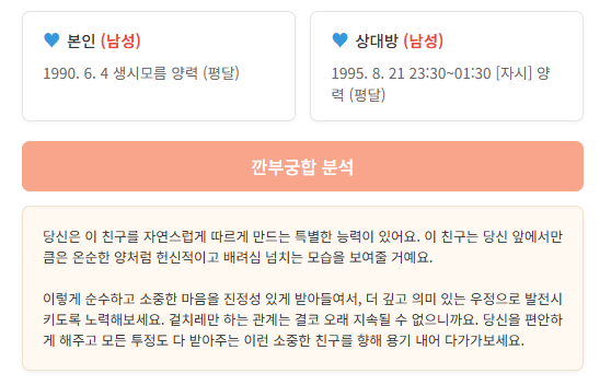 이처럼 특별한 사연을 가진 두 사람의 궁합을 사주를 통해 알아보았다. 온라인 사주 전문 플랫폼 위키사주에 따르면 진해성은 박서진을 자연스럽게 따르게 만드는 특별한 능력이 있다. 서로 헌신적이고 배려심 넘치는 모습을 보여준다. 서로 순수하고 소중한 마음을 진정성 있게 받아들여 더 깊고 의미있는 우정으로 발전될 수 있으며, 편안하게 해주고 모든 투정을 다 받아주는 이런 친구와 오랜 만남이 지속 가능하다.