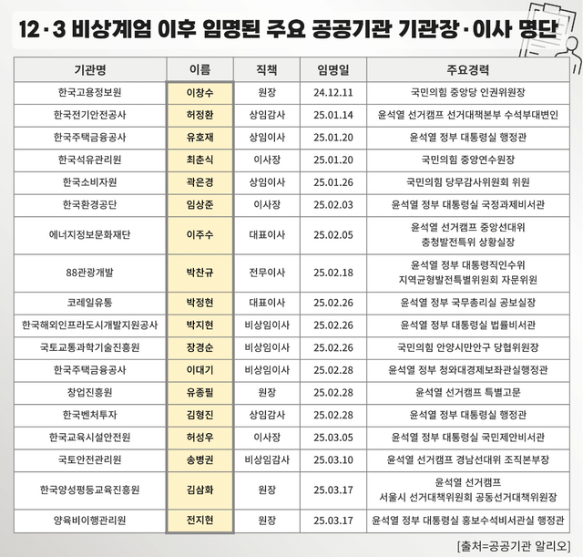 이 밖에 비상계엄 이후 공공기관 기관장과 상임감사에 임명된 ▲김삼화 한국양성평등교육진흥원 원장 ▲허정환 한국전기안전공사 상임감사 ▲송병권 국토안전관리원 비상임감사 ▲박찬규 88관광개발 전무이사 등은 모두 윤석열캠프 출신이다. 또 ▲최준식 한국석유관리원 이사장 ▲박정현 코레일유통 대표이사 ▲김형진 한국벤처투자 상근감사 ▲박찬규 88관광개발 전무이사 ▲전지현 양육비이행관리원 원장 등은 국민의힘 출신이거나 대통령실 근무 경험을 가지고 있다.