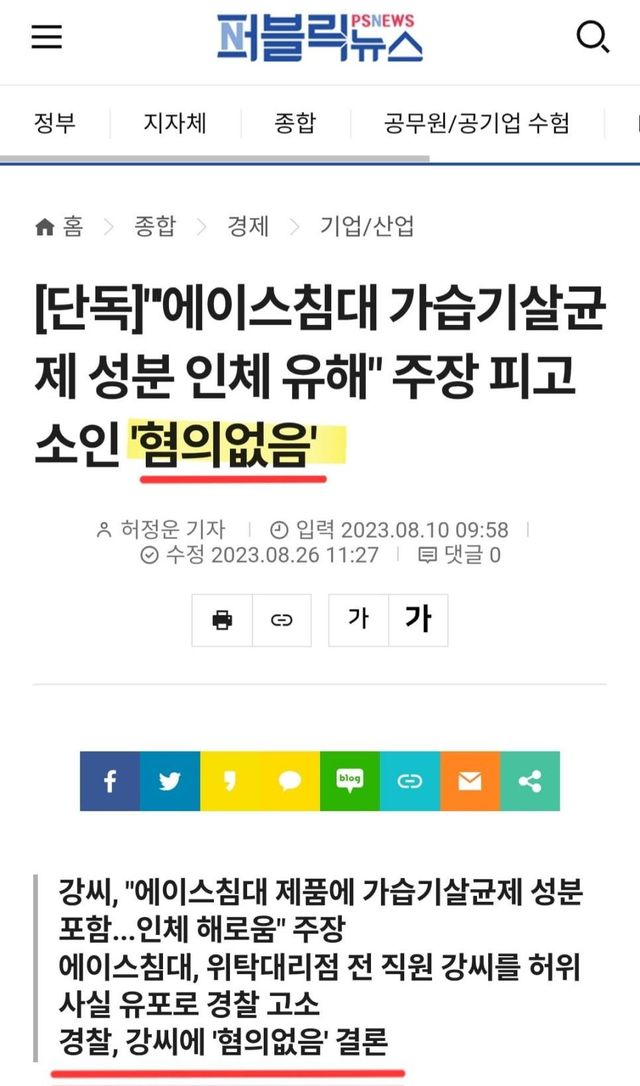 에이스침대 가습기살균제 성분 사용 사실이 없다고