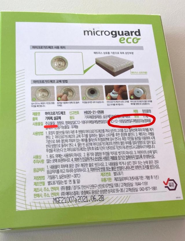 에이스침대 마이크로가드 에코에 주요물질인 (C12-C18)