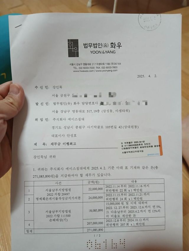 그리고 2억7천만원을 갚으라는 내용증명 받고 이제는