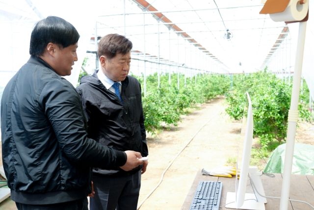 제주도는 2일 서귀포시 대정읍 일과리에 위치한 ‘왕빵팜’을 찾아 저비용 스마트팜 구축 현황을 살펴봤다. 이곳은 청년농업인 현왕철 씨(38)가 운영하는 2,970㎡(900평) 규모의 감귤 비가림하우스로, 최소한의 비용으로 스마트팜을 구현한 사례다.