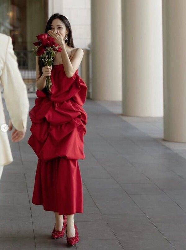 공개된 사진 속 효민은 강렬한 붉은색 드레스를 입고 이국적인 풍경을 배경 삼아 다채로운 포즈를 취하고 있다. 특히 남편에게 꽃다발을 건네받은 순간 포착된 효민의 얼굴에는 행복한 미소가 가득해 보는 이들까지 훈훈하게 만들었다.