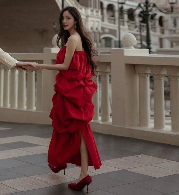 특히 효민은 빨간 드레스와 빨간 구두, 빨간 장미에 빨간 입술 메이크업까지 하며 마치 '인간 장미'처럼 보이는 올 레드 룩을 선보였다. 여기에 큼지막한 다이아몬드 반지가 어우러져 고급스러움을 한층 더했다.