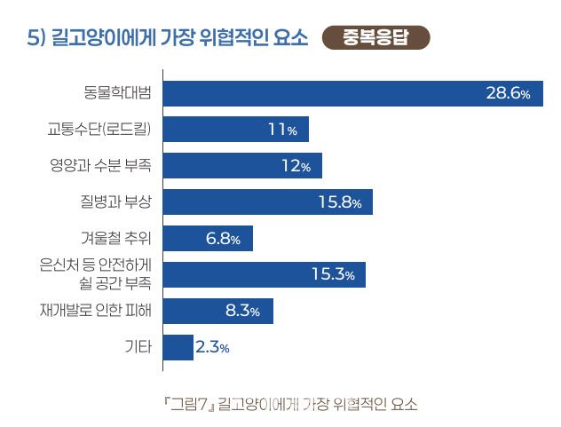 또한 길고양이에게 가장 위협적인 요소에 대한 중복 허용 응답에서 ‘동물학대범’을 선택한 케어테이커는 62.6%로 가장 많았고, 질병과 부상을 선택한 이들은 34.6% 뒤이어 안전하게 쉴 공간의 부족을 선택한 이들은 33.5%였습니다.
