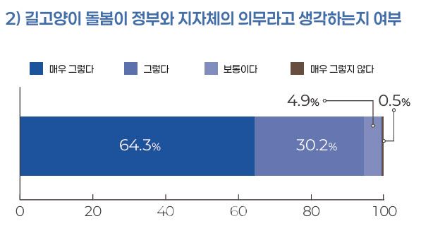 케어테이커들은 길고양이를 돌보는 일에 대해 ‘보호를 위한 일, 개인의 자유, 공공의 자원 부족으로 시민이 나서는 일’ 등 긍정적으로 평가한 응답이 96.5%를 차지했습니다.