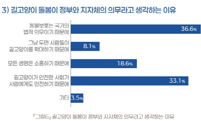 길고양이 돌봄이 정부와 지자체의 의무에 관한 생각에서 매우 그렇다과 그렇다라고 응답한 172명을 대답한 응답자를 중심으로 길고양이 돌봄이 정부와 지자체의 의무라고 생각하는 이유를 확인한 결과 ‘동물보호는 국가의 법적 의무이기 때문에’가 36.6%(63명)로 가장 높은 비율을 차지했고, 이어서 ‘길고양이가 안전한 사회가 사람에게도 안전하기 때문에’가 33.1%(57명), ‘모든 생명은 소중하기 때문에’가 18.6%(32명), ‘그냥 두면 사람들이 길고양이를 학대하기 때문에’가 8.1%(14명), 마지막으로 기타 의견이 3.5%(6명) 순으로 나타났습니다.