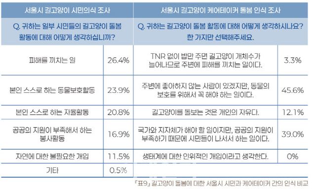 반면 일반 서울 시민들은 길고양이를 돌보는 일에 대해 ‘자율활동, 동물보호활동, 공공의 자원 부족으로 시민이 나서는’ 등 긍정적으로 평가한 응답이 61.6%를 나타내며 케어테이커들과의 인식에서 차이를 보였습니다. 일반 서울 시민 설문의 경우 표본 수 1000명을 대상으로 지난해 5월~6월 온라인 패널을 활용한 웹조사로 진행이 됐습니다.