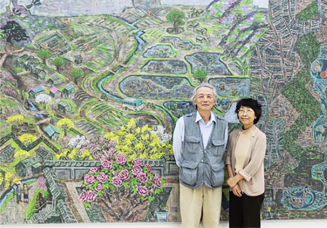 양수리 작업실에는 봄빛 가득한 캔버스가 벽면을 채우고 있다. 봄처럼 화사한 캔버스를 보면서 '미소는 미소를 부르고, 슬픔은 슬픔에 답한다'는 고대 로마의 시인 호라티우스의 격언이 생각났다. 민정기 선생님은 예전에는 주로 자연에 초점을 맞춰 그렸는데 요즘에는 자연과 인간이 공존해 살아가는 모습을 주로 그리고 있다고 한다. 말씀을 듣고 보니 30여 년 전 처음 뵈었을 때 선생님 작품은 눈부신 산과 그 아래를 유유히 흐르는 강, 휘어진 소나무와 활짝 핀 진달래가 주요 소재였는데 어느 순간 자연을 경계로 살아가는 사람들의 모습과 사람들이 만들어 놓은 건축물들이 빼곡히 캔버스를 차지하고 있다.