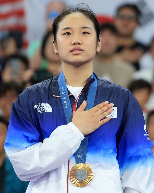 대한민국 배드민턴 대표팀 안세영이 지난해 프랑스 파리 라 샤펠 아레나에서 열린 2024 파리올림픽 배드민턴 여자 단식 시상식에서 애국가가 울려퍼질때 국민의례를 하고 있다. / 뉴스1