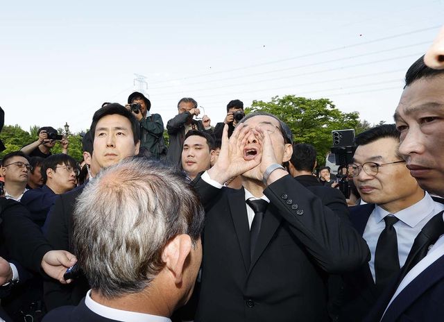 한덕수 전 국무총리가 2일 오후 광주시 국립5.18민주묘역에 참배하려다 시민단체 반발로 입장이 막히자 "나도 호남사람입니다"라고 외치고 있다. / 뉴스1