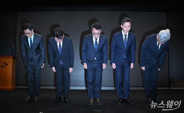 유영상 SK텔레콤 대표를 비롯한 임원들이 25일 서울 중구 SKT타워에서 지난 22일 발생한 해킹공격으로 가입자 유심(USIM) 정보가 유출된 것과 관련해 고개 숙여 사과하고 있다. 사진=이수길 기자 Leo2004@newsway.co.kr
