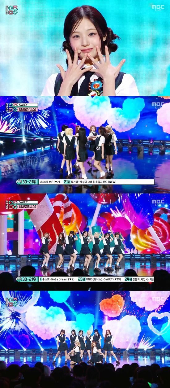 유니스(진현주, 나나, 젤리당카, 코토코, 방윤하, 엘리시아, 오윤아, 임서원)는 3일 오후 방송된 MBC '쇼! 음악중심'에 출연해 두 번째 미니앨범의 타이틀곡 'SWICY(스위시)' 무대를 꾸몄다.