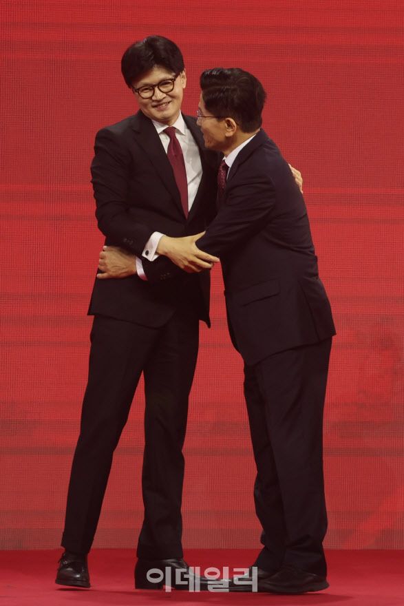 김문수 후보는 지난 1~2일 진행된 당원 선거인단 투표(50%)와 국민 여론조사(50%) 결과 56.53%를 최종 합산 득표했다. 한 후보는 43.47%의 합산 득표율에 그쳤다.