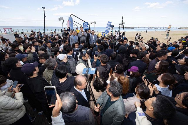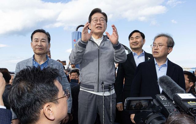 '골목골목 경청투어 : 동해안벨트편'에 나선 이재명 더불어민주당 대통령 후보가 3일 오후 강원 삼척시 삼척해수욕장에서 시민들을 향해 발언하고 있다. / 뉴스1