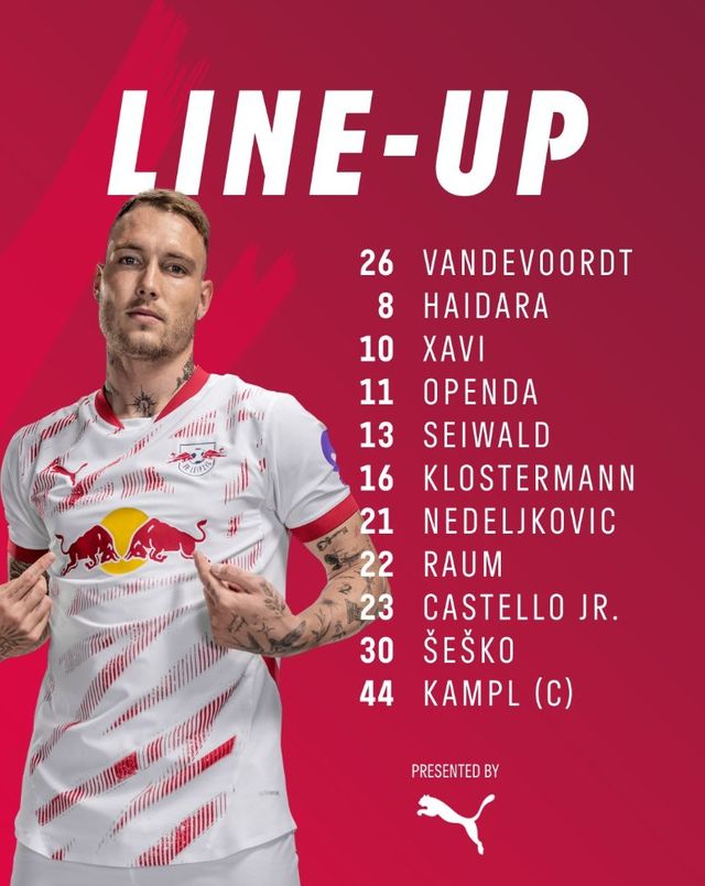 홈팀 라이프치히는 4-4-2 전형으로 맞선다. 마르턴 판더보르트가 골키퍼 장갑을 끼고, 다비트 라움, 카스텔로 뤼케바, 루카스 클로스터만, 코스타 네델코비치가 백4를 형성한다. 중원엔 사비 시몬스, 아마두 아이다라, 니콜라스 자이발트, 케빈 캄플이 출전하고, 최전방에서 로이스 오펜다와 베냐민 셰슈코가 뮌헨 골문을 노린다.