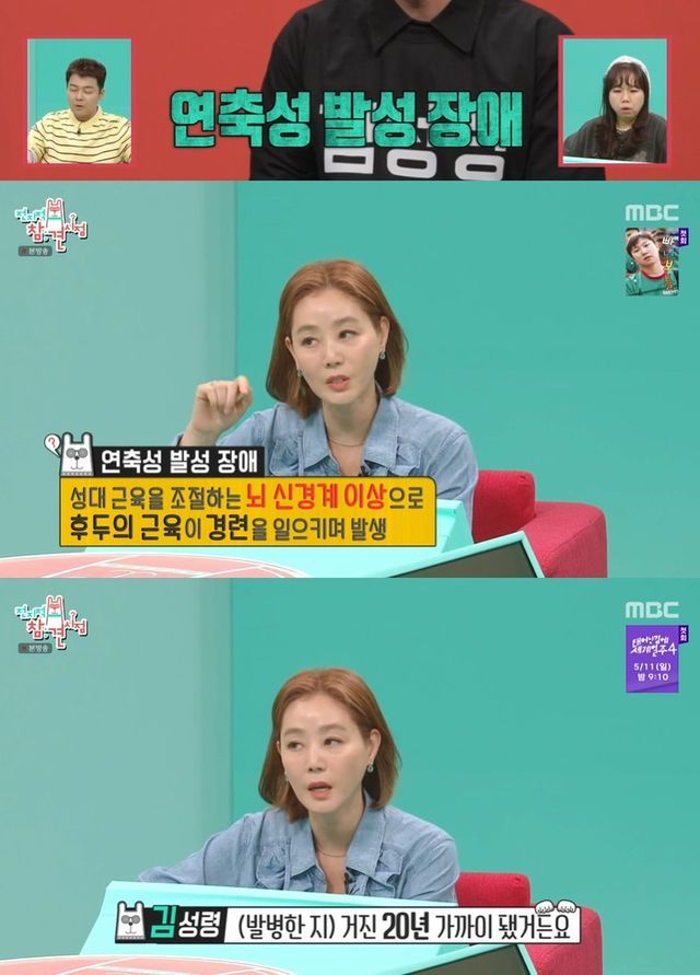 매니저는 "연축성 발성 장애다. 꽤 오래됐다"며 김성령의 병을 고백했고, 전현무가 자세한 증상을 묻자 김성령은 "자율 신경계가 깨져서 이유 없이 (성대가) 강직이 된다. 긴장하지 않은 상황에서도 긴장하게 된다"며 20년 가까이 앓고 있음을 밝혔다.