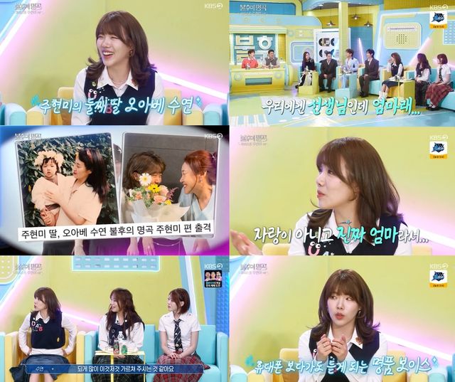 수연은 "나야말로 주현미의 애제자라는 말씀을 하셨더라"라는 질문에 "되게 많이 이것저것 알려주신다. 엄마가 목을 풀고 계시는데"라고 이야기했다.