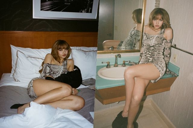 공개된 사진 속 리사는 뱀 가죽 디자인의 초미니 원피스를 입고 다양한 포즈를 취하고 있다.