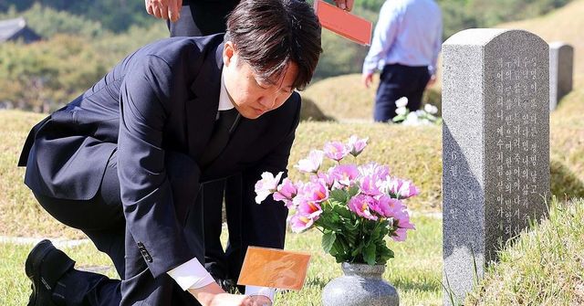 이준석 개혁신당 대선 후보가 4일 오전 광주 북구 국립 5·18 민주묘지에서 참배하고 있다. / 연합뉴스