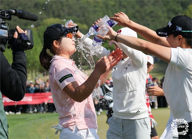 홍정민의 우승 후 동료들에게 물세례를 받고 있다.