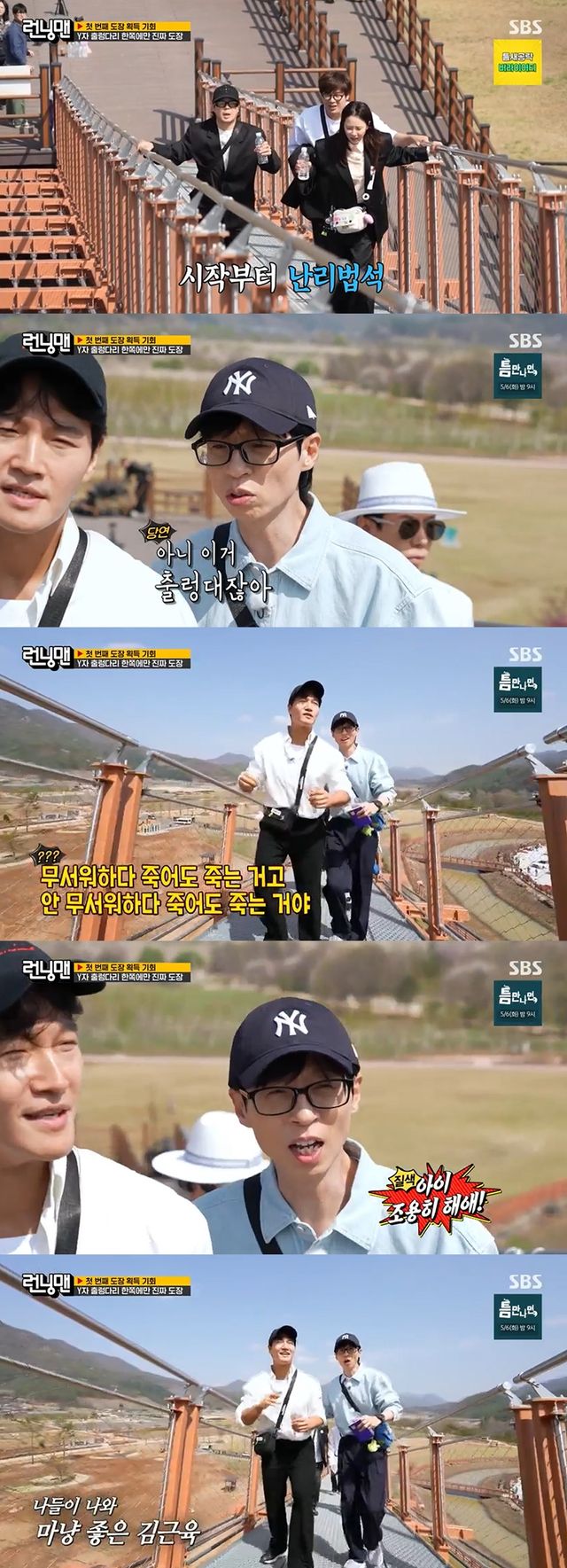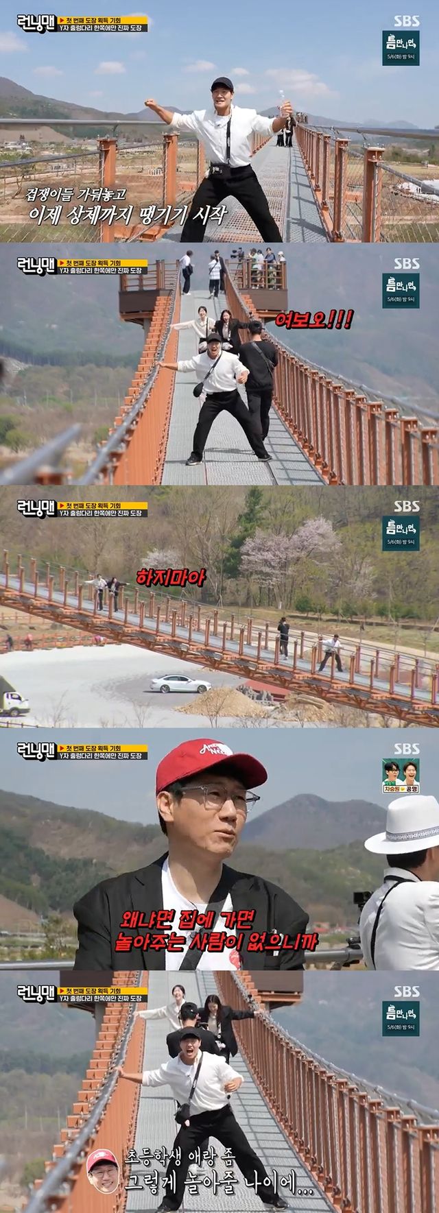 그러던 중, 갑작스럽게 다리가 심하게 흔들리기 시작했다. 이는 김종국이 다리를 넓게 벌려 일부러 출렁임을 유도한 것. 이에 멤버들은 "하지 마", "진짜 끊어진다"며 당황했고, 김종국은 아랑곳하지 않고 노래를 부르며 계속해서 장난을 이어갔다.