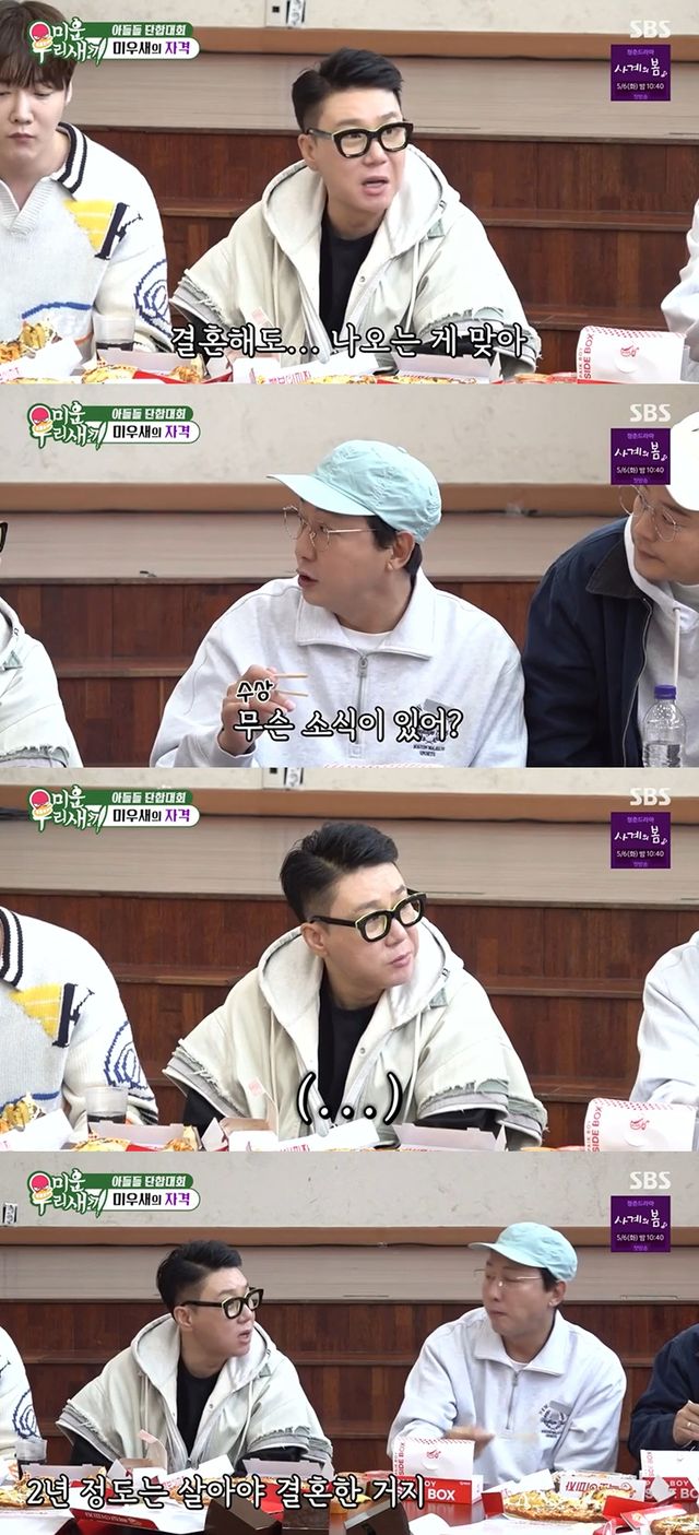 탁재훈은 "무슨 소식이 있어?"라고 수상쩍은 눈빛을 보였고, 이상민은 잠시 아무런 말도 하지 못하더니 "2년 정도는 살아야 결혼한 거다"라고 주장했다.