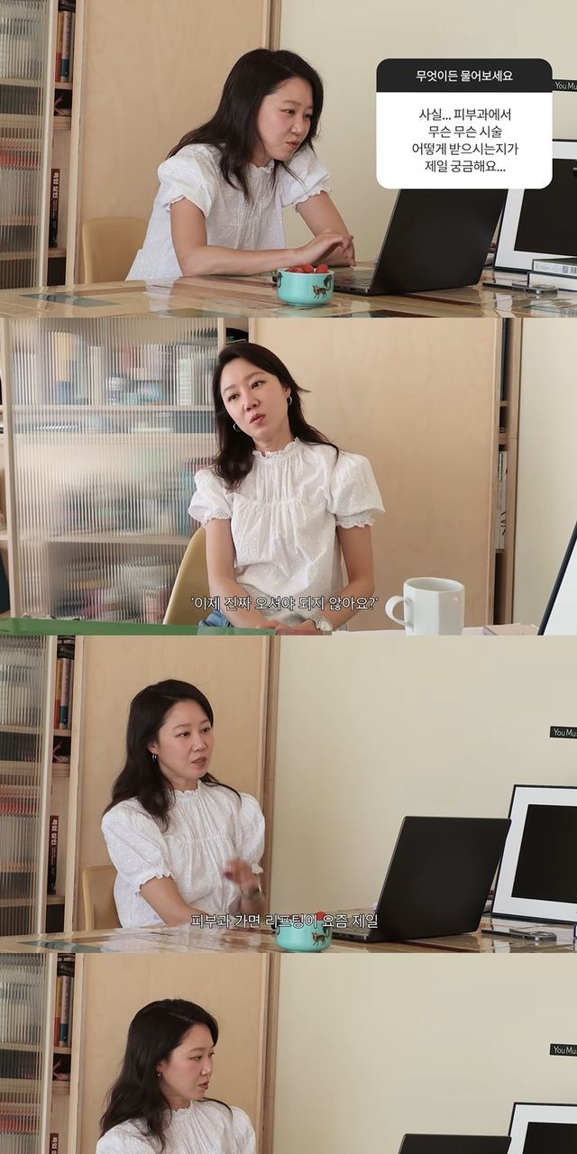 이날 공효진은 구독자들의 다양한 질문에 직접 답하며 진솔한 시간을 가졌다. 피부과에서 어떤 시술을 받냐는 질문에 그는 "알겠다. 얘기해주겠다. 피부과는 '이제 진짜 오셔야 되지 않아요?' 할 때 간다. 이렇게 안 오는 사람 처음이라며 옛날부터 그랬다"고 답했다.