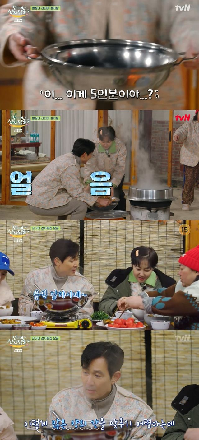 저녁 준비 3시간에 걸쳐 염정아 표 산더미 감자탕이 완성됐다. 이정재는 박준면이 들고오는 거대한 그릇을 보더니 "이게 5인분이야?라며 당황했고, 염정아는 이정재를 가리키며 "소식좌이시다"라고 설명했다.