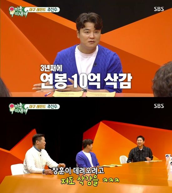 이날 스페셜 MC로 '야구 레전드' 추신수가 스튜디오에 출연해 母벤져스의 격한 환영을 받았다. 누적 연봉이 무려 1,900억으로 역대 한국인 메이저리거 연봉 1위 기록을 가진 추신수는 "팀 전체 연봉 상한선이 있는데 제가 3년째에 팀을 위해 10억을 깎았다. 작년에는 3천만 원 기본 연봉만 받았다"라고 밝혀 감탄을 자아냈다. 신동엽은 "'미우새'에 서장훈을 데려오려고 제 출연료를 깎았다"며 너스레를 떨었다.