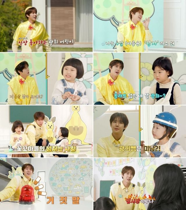 어린이날인 5일(오늘) 공개되는 ‘랜선육아왕: 꽃꼬마프로젝트’ 첫 회에서는 ‘유치원 선생님’ 역할을 맡게 된 황광희가 새롭게 만난 아이들과 친해지기 위해 고군분투하는 현장이 담긴다. 먼저 황광희는 노란색 모자와 망토를 장착한 채 강렬하게 등장, “엄마, 유치원 다녀오고 나서 백화점 명품관에 신상 같이 보러 가요~”라는 ‘욕망 멘트’를 던져 시작부터 웃음을 안긴다. 이어 다섯 ‘꽃꼬마’들과 만난 황광희는 자신의 ‘부캐’를 설정, “나는 네 살 ‘왕자’야~”라며 아이들과 반갑게 인사를 나눈다. 순수한 아이들은 황광희가 ‘네 살’이라고 소개한 것을 대번에 믿어버리는데, 그 결과 황광희는 ‘네 살 세계관’을 공고히 유지한 채 아이들과 실제 친구처럼 소통을 이어 나가 뜻밖의 ‘육아 베테랑’ 면모를 드러낸다.