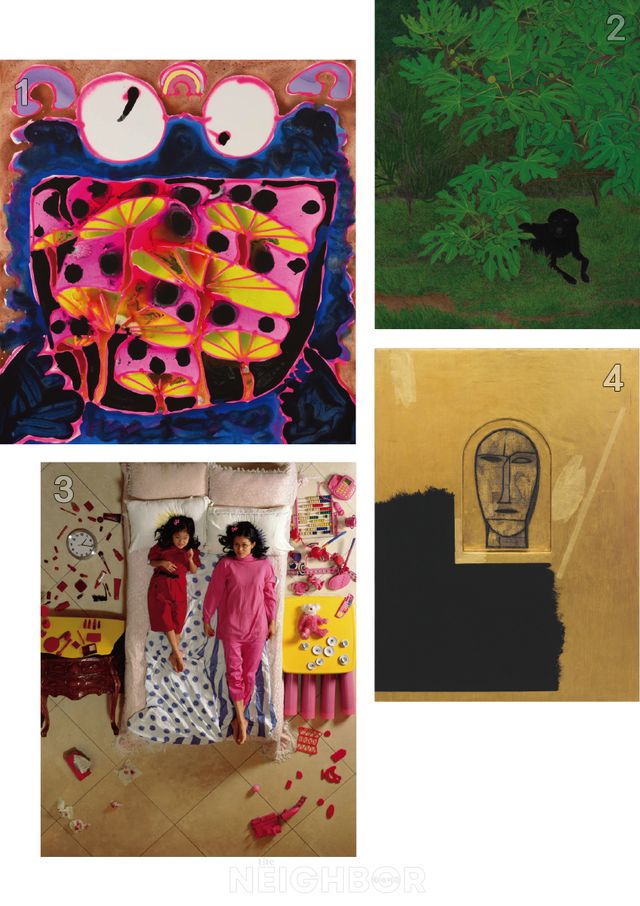 1 Katherine Bernhardt, ‘Crazy Monster Druggie’, 2024. 2 Kim Bohie, ‘Towards’, 2025. 3 Yeondoo Jung, ‘Afternoon Nap’, 2004. 4 Mimmo Paladino, ‘Aurea Aetas 1’, 2022.