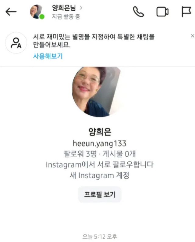 양희은은 함께 올린 글을 통해 “이러한 가짜 계정이 올라 있고, 여기서 사람들께 사연이 가는가 보다”면서 “내 계정보다 숫자 하나(3)가 더 보인다. 조심하시라. 지인들이 신고해 줬다”고 주의를 당부했다.