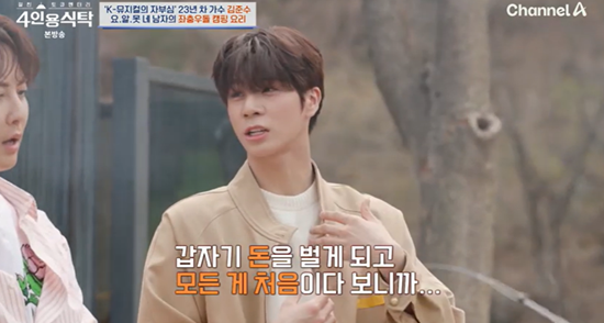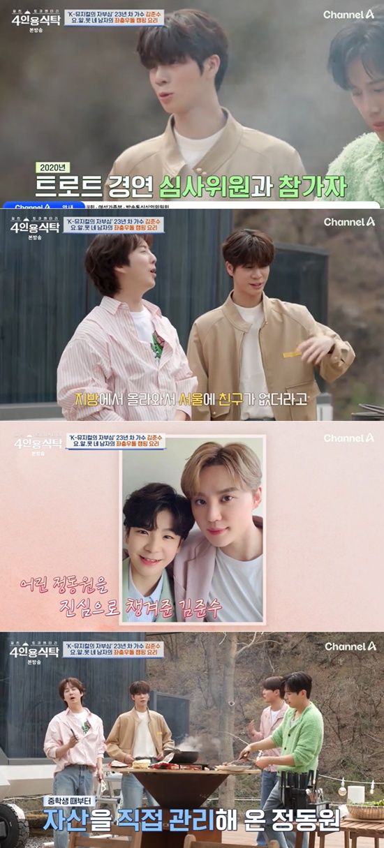 5일 방송된 채널A '절친 토큐멘터리 - 4인용식탁'에는 김준수 편으로 꾸며진 가운데, 뮤지컬 배우 손준호, SS501 김형준, 가수 정동원을 초대해 4인용 식탁을 꾸몄다.