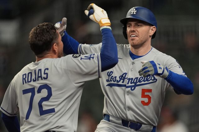 Los Angeles Dodgers' Freddie Freeman (5) celebrates hitting a three-run homer against the Atlanta Braves in the eighth inning of a baseball game, Sunday, May 4, 2025, in Atlanta. (AP Photo/Mike Stewart)/2025-05-04 14:44:10/