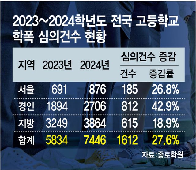 종로학원은 이러한 내용의 ‘최근 2년(2023~2024년)간 학폭 심의 건수 현황’을 6일 공개했다. 이는 학교알리미 공시자료를 토대로 전국 2380개 고등학교를 대상으로 조사한 결과다. 이에 따르면 지난해 전국 고등학교 학폭 심의 건수는 총 7446건으로 2023년(5834건)보다 1612건(27.6%) 급증했다.