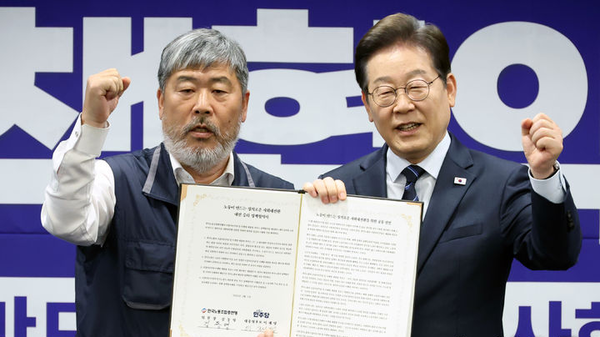 6일 한국노동조합총연맹(한국노총)과 더불어민주당에 따르면 이 후보는 지난 1일 서울 중구 프레스센터에서 김동명 한국노총 위원장과 정책협약을 맺고 '노조할 권리보장 및 사회연대 교섭체계 확립'에 뜻을 모으기로 했다.