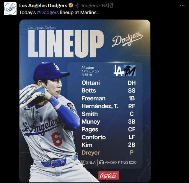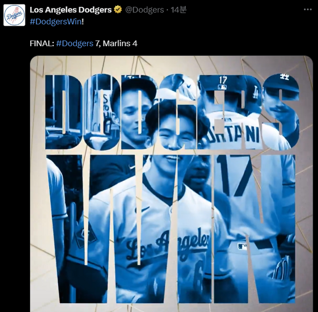 한편, 이날 다저스는 마이애미 멀린스에 7-4로 승리했다. 1회 테오스카 에르난데스의 1타점 2루타로 선취점을 뽑은 다저스는 3회 프리먼의 통산 350호 투런포, 5회 김혜성을 불러들이는 오타니의 투런포 등을 앞세어 마이애미를 제압했다.