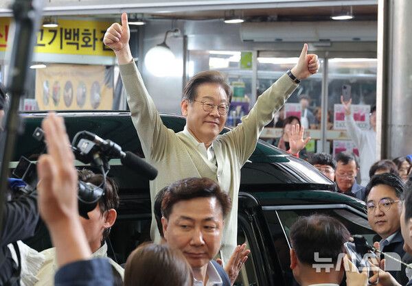 제21대 대통령선거를 약 한 달 앞둔 가운데 이재명 더불어민주당 대통령 후보가 김문수 국민의힘 대통령 후보 또는 한덕수 무소속 대통령 선거 예비 후보, 그리고 이준석 개혁신당 후보와의 3자 대결에서 50% 가까운 지지율을 기록하고 있다는 여론조사 결과가 6일 나왔다.
