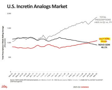 6일 미국 외신 보도에 따르면 미국 일라이릴리는 지난 1분기 GLP-1(글루카곤 유사 펩타이드 주사형, 경구용)과 GIP 이중 작용 메커니즘 의약품 점유율 53.3%로 노보노디스크(46.1%)를 앞질렀다. 시가총액에서 앞선 이후 점유율까지 앞지른 것이다. 일라이릴리의 6일 기준 시가총액은 7785억불(약 1081조원)이며 노보노디스크는 2327억불(약 323조원)으로 격차가 벌어지는 추세다.