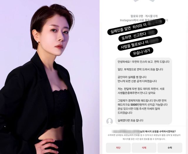 이어 상대방은 '경제적 지원'을 제안하며 "만나면 먼저 해드린다. 5000만 원까지 선지급 가능하다. 관심 있으면 자세히 알려드리겠다"면서 "실례였다면 죄송합니다"라고 덧붙였다.