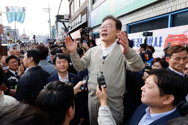 이재명 더불어민주당 대통령 후보가 골목골목 경청투어 이틀차인 6일 오후 충남 금산군 금산로를 찾아 즉흥 연설하고 있다. / 뉴스1