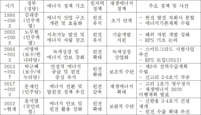 김대중 정부 이후 윤석열 정부까지 에너지 정책 흐름을 보면 크게 다음과 같이 정리할 수 있다.
